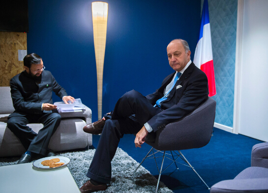 法国外长法比尤斯(右)10日在会晤印度代表团时沉思/法新社