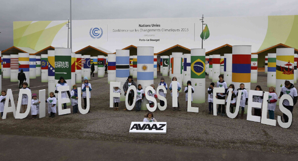一群儿童11日在巴黎气候大会会场外摆出“再见化石”的字样/ 路透社