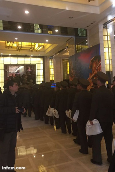“来了,来了”,一位中年男人用近乎尖叫的声音叫道,朝鲜牡丹峰乐团的女兵们从电梯里走了出来。