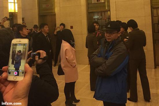 据南方周末记者了解,中午前来围观的人群都是民族饭店的住店客人,今天媒体报道朝鲜最著名的乐团女兵也在这个酒店,酒店大堂的人便多了起来。