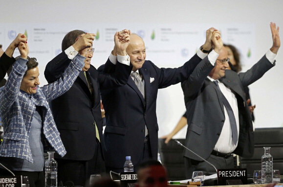 联合国秘书长潘基文、法国总统奥朗德与法比尤斯携手起立,向与会代表致意。奥朗德向各国代表祝贺:“为了达成这个协定,已经等了40年,现在你们(与会谈判代表们)做到了,有了一个雄心勃勃、有约束力、全球的协定,你们的子孙都会为你们自豪。”