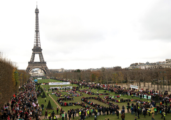 图:多个NGO12日在艾菲尔铁塔前筑起人链,呼吁应对气候变迁/法新社
