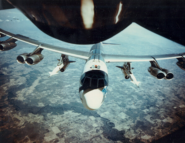 图:1963年未知地点,一架挂着猎犬导弹的美军B52轰炸机飞近一架空中加油机 美国国家档案馆