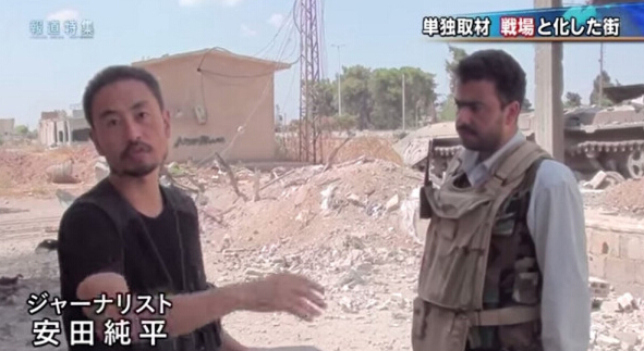 图:日本记者安田纯平(左)传被叙利亚武装组织绑架。图为他在中东战场采访 网上图片