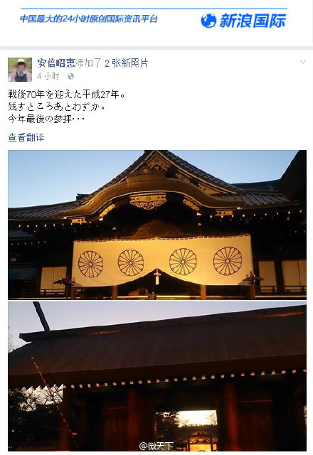 【安倍夫人在Facebook发帖称参拜了靖国神社】日本首相安倍晋三的夫人安倍昭惠28日在自己的“脸书”(Facebook)上发帖称参拜了靖国神社。帖子谈及2015年正值战后70周年,写明“剩下的时间不多了。今年最后的参拜……”此外,安倍昭惠至少在5月和8月参拜过靖国神社,并都在Facebook上发了帖。