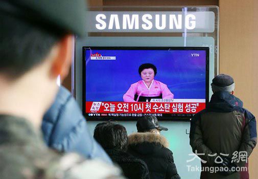 当地时间2016年1月6日,韩国首尔,军人和民众在火车站观看朝鲜宣布实施氢弹试验的电视报道。图片来源:视觉中国