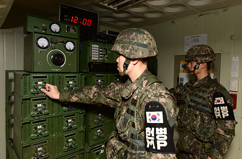 韩国军方有关人士表示,已于8日中午在10多处前线地区如期启动对朝鲜的扩音喊话。据了解,扩音喇叭将接收并放大《自由之声》的广播信号,每处喇叭每天昼夜不定不规则地喊话2到6个小时,功率调至最大时,夜间声音可传播约24公里,白天可传播10多公里,能覆盖朝鲜边境广大地区。韩军还将机动部署6辆高性能的心战喊话车。