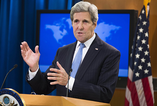 图:美国国务卿克里7日在与中国外长王毅通电话后举行记者会\法新社