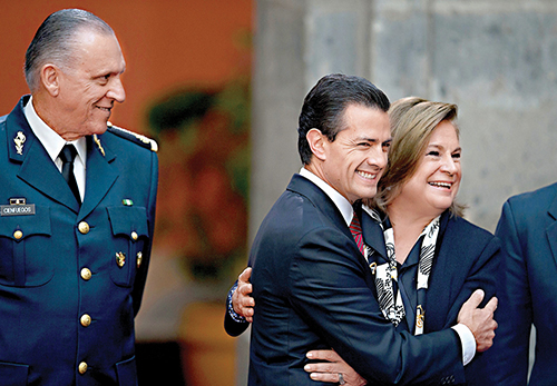 图:墨西哥总统培尼亚(中)8日拥抱总检察长戈麦斯,庆祝古兹曼落网\美联社