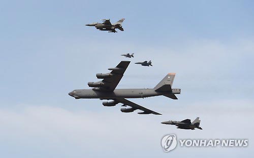 当天,韩美两国发布消息称,美军B-52战略轰炸机从关岛安德森空军基地出发,进入驻韩美军乌山空军基地临近空域,然后返回关岛。B-52轰炸机在韩美空军四架战斗机的护航下飞越驻韩美军乌山空军基地上空。