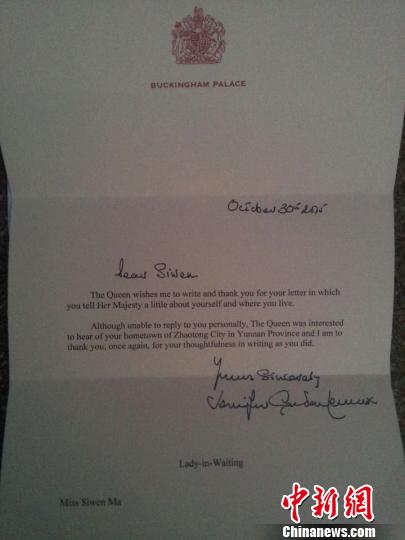 “你是不是喝酒了,说浑话,英国女王怎么可能会回信!”这是马思雯在昆明工作姐姐的第一反应,直到马思雯用微信将信封、内容的照片给姐姐传了过去。