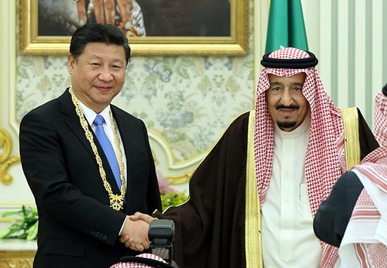 图:习近平19日在利雅得同沙特阿拉伯国王萨勒曼举行会谈,萨勒曼向习近平授予勋章/新华社