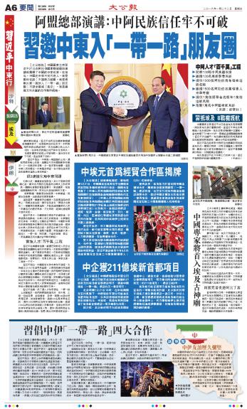 大公网1月22日讯 中国国家主席习近平21日在阿拉伯国家联盟总部演讲时阐释了中国的中东政策,他指出,中国在中东不找代理人,而是劝和促谈;不搞势力范围,而是推动大家一起加入“一带一路”朋友圈;不谋求填补“真空”,而是编织互利共赢的合作伙伴网络。
