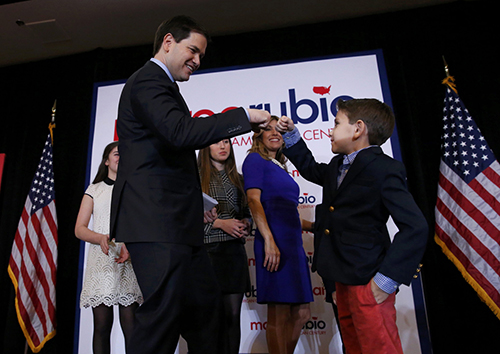 图:共和党参选人之一的鲁比奥与儿子击拳庆祝/路透社