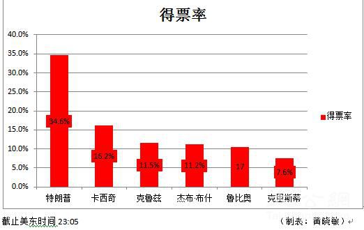 尽管计票工作仍在进行,但两党主要参选人都已先后发表选后感言。据初步统计结果,共和党的特朗普得票率约34%,排在第二位是的前俄亥俄州长卡西奇,得票率约16%。在民主党方面,桑德斯得票率高达59.6%,高出希拉里21个百分点,希拉里的得票率是38.6%。