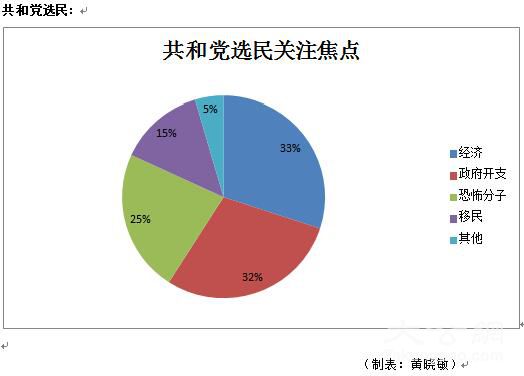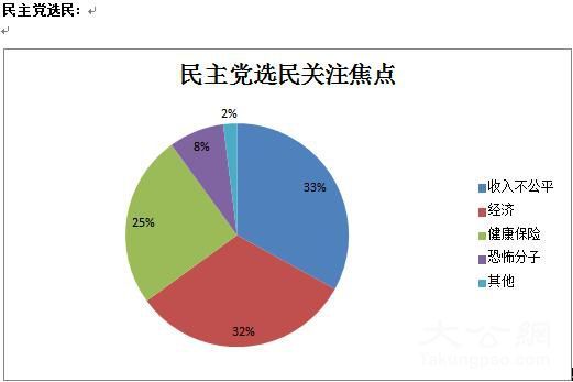 【驻纽约记者黄晓敏】 据投票站出口民调显示,共和、民主两党选民虽然各有各的政治诉求,对候选人也各有喜好,但是,两党选民都将经济议题列为最关心议题之一,其中共和党选民中,有33%的选民将经济列为最关心议题的首位,在民主党选民中,有32%的选民将经济列为最关心议题的第二位,仅次于收入不公平。详见下面两张图表。