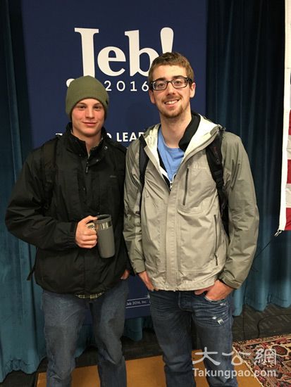 杰布布什的支持者、大学生詹姆森·普克(左)和布莱特·凯尔(右) 大公报记者 黄晓敏摄