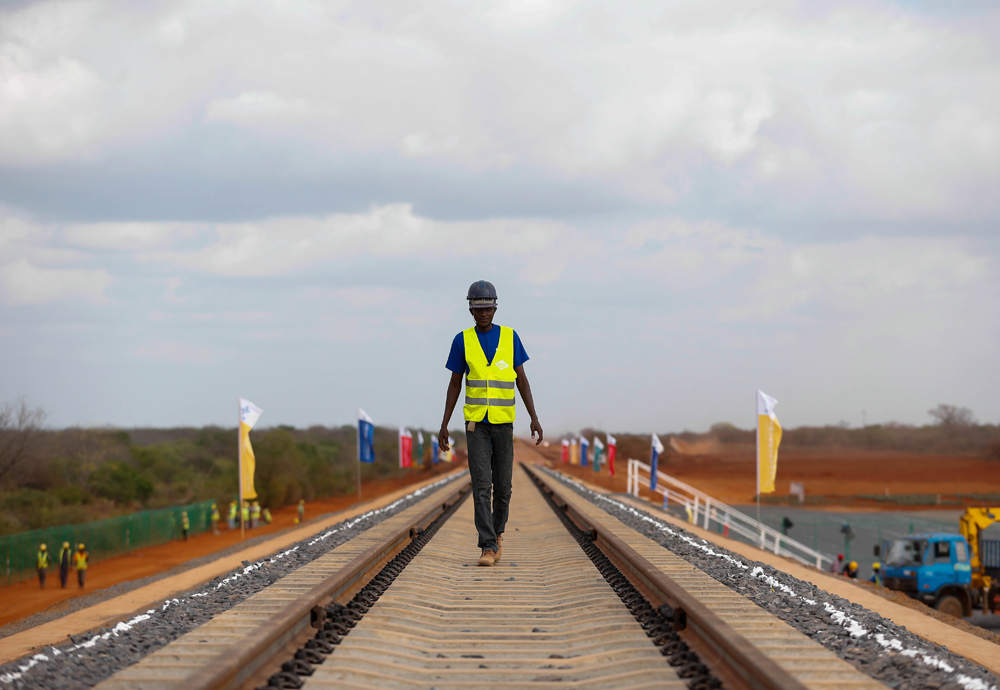 图:在肯尼亚蒙巴萨─内罗毕铁路铺轨试验段项目现场,一名肯尼亚工人从铁轨上走过/资料图片