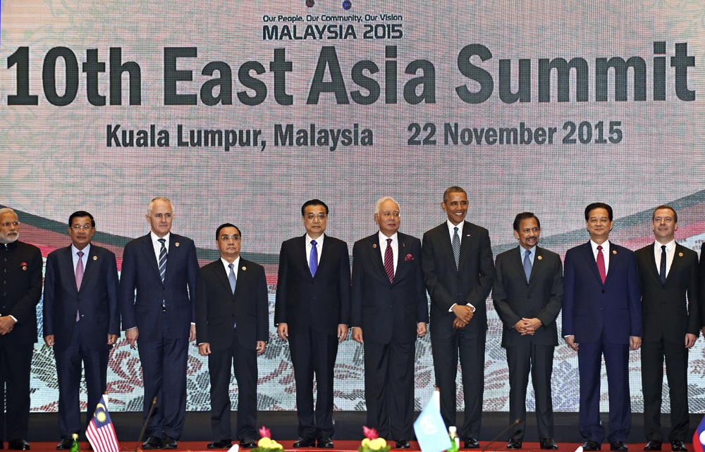 图:去年11月,中国总理李克强(左五)及美国总统奥巴马(右四)在吉隆坡与东盟国家领导人召开峰会/美联社
