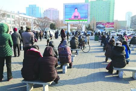 1月6日,在朝鲜首都平壤火车站,广场大屏幕前聚集着平壤市民观看关于朝鲜氢弹试验成功的报道。 图:新华社