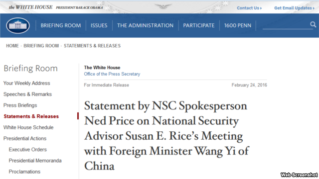 白宫新闻办公室发布关于美国国家安全顾问赖斯(Susan Rice)星期三在白宫会见中国外长王毅的声明(白宫网站截图)