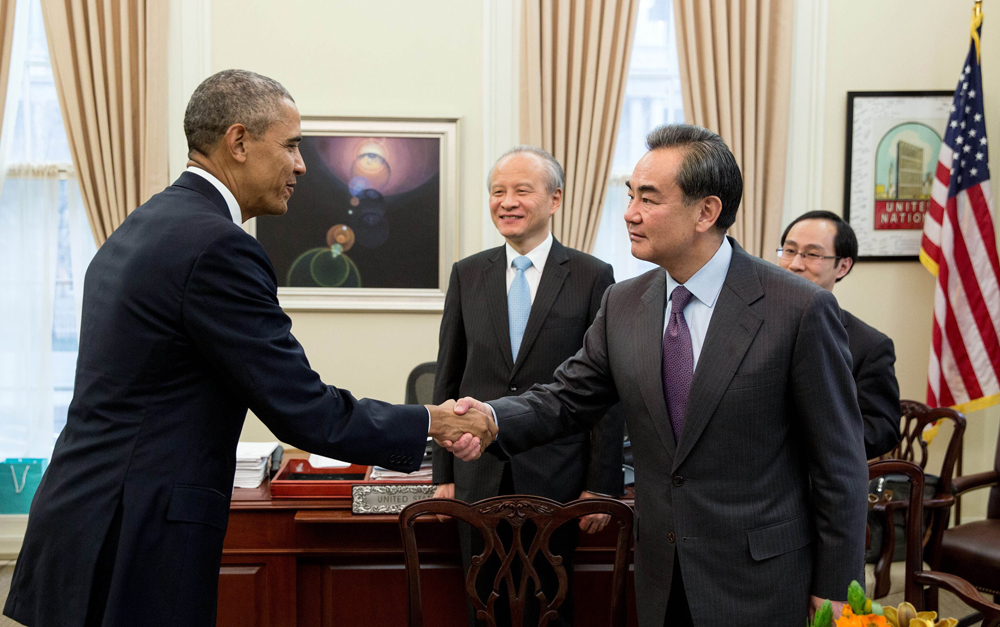 图:24日,奥巴马(前左)在华盛顿白宫会见正在美国进行正式访问的王毅(前右) 新华社