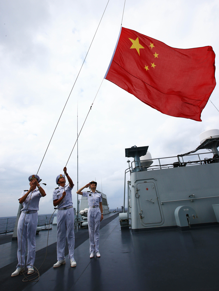 图:海军“井冈山”舰舰员在南海某海域升起国旗 资料图片