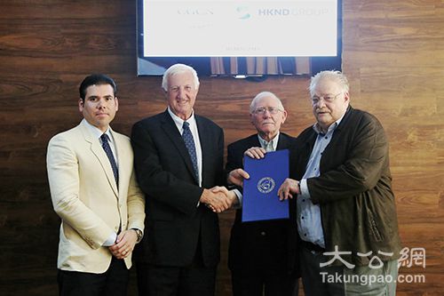 HKND集团首席项目顾问比尔-怀尔德(左二)接受运河委员会执行秘书、尼加拉瓜总统府公共政策秘书长保罗-奥奎斯特博士(右一)颁发的环境许可