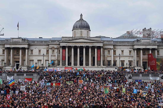 图:英国数万民众27日在伦敦特拉法加广场示威,抗议当局计划更新三叉戟潜舰核武系统/法新社