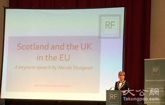 同时担任苏格兰第一大政党、苏格兰民族党(SNP)党魁的斯特金,当天出席由英国智库机构“决议基金会” (Resolution Foundation)举办的一场活动时发表演讲,她对现场700多名听众表示,过去40多年来,欧盟成员国身份有助于英国保持繁荣,相信作为欧盟的一分子,英国今后会继续从中获益。因此她希望,在6月23日的退出欧盟公投中,“留欧”阵营能取得压倒性胜利。