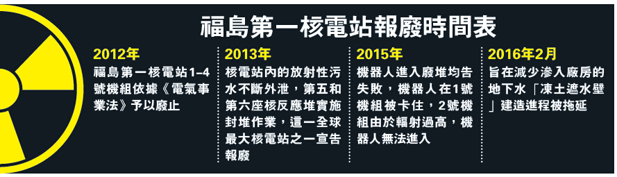 在核电站堆芯熔毁的1号、2号和3号机组中,前两个机组情况最为复杂,内部温度最高。3号机组由于爆炸坍圮,安全壳内的垃圾很多,可谓各自面临不同的困难。5年过去了,除了用大量海水进行冷却外,其他处理工作毫无寸进。
