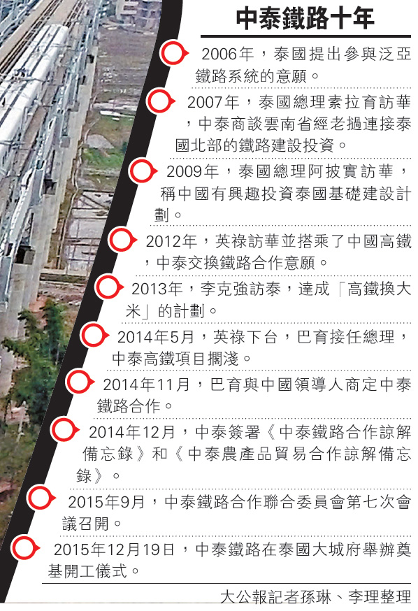 两年后,2015年12月3日,中泰两国政府才签署了中泰政府间铁路合作框架文件,以及100万吨泰国大米进口合同。12月19日铁路操作控制中心的奠基仪式在泰国大城府的清惹克农火车站举行。