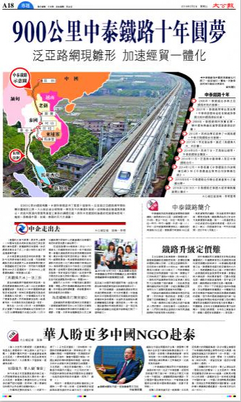 编者按:近900公里的铁路规划,中国和泰国谈判了整整十个春秋。在这个泛亚铁路网早期收获初露端倪之际,大公报记者沿线探查,寻找其中的机遇和风险。这条联通老挝边境与曼谷,然后向东通向泰国马达普工业区的钢铁巨龙,将和中老铁路相连最终抵达云南昆明,绘就一张联通中国、老挝、泰国的巨大交通图。