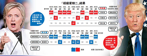 大公网3月3日讯(驻纽约记者 黄晓敏)倍受瞩目的美国总统初选首个“超级星期二”于3月1日落幕,共和党参选人特朗普和民主党参选人希拉里分别大胜党内对手,各自向七月揭晓的党内提名又迈进了一步。