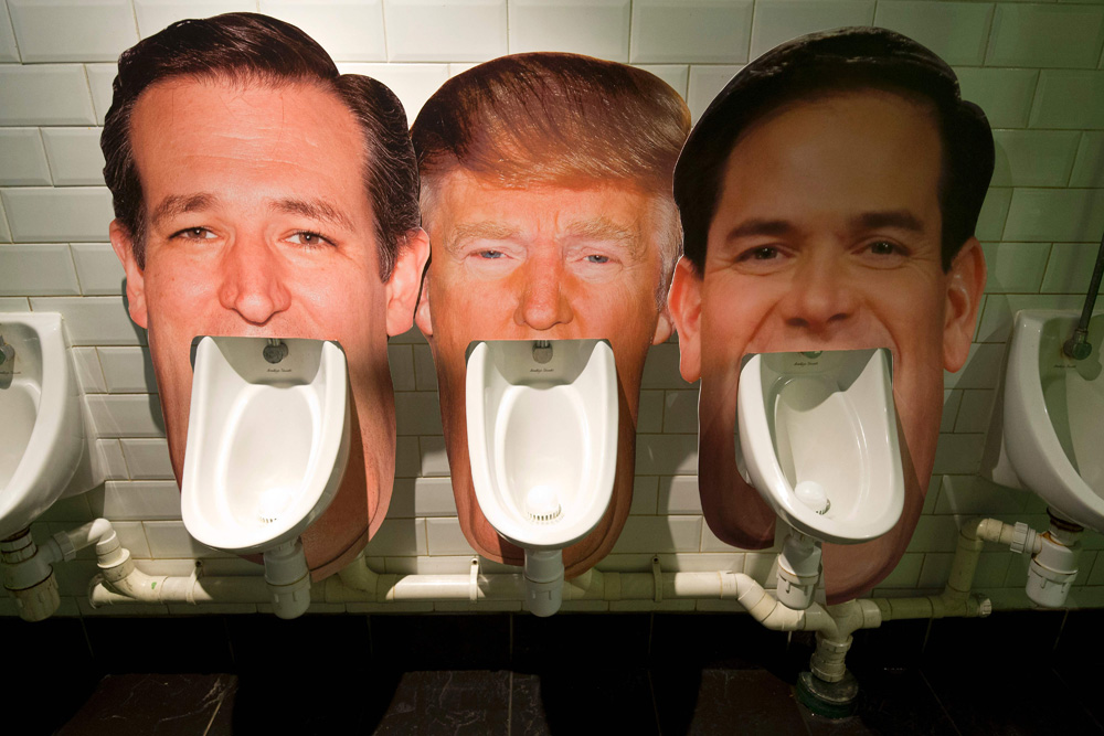 图:伦敦一间男厕将克鲁兹(左)、特朗普(中)及鲁比奥的头像放在尿斗旁\法新社