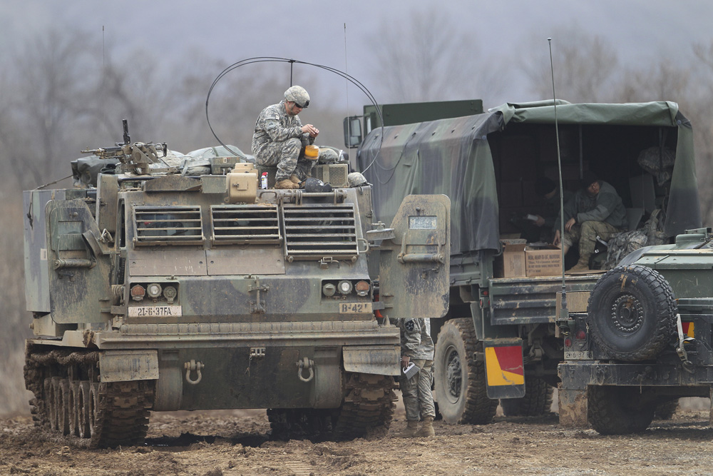 图:参与美韩军演的美国士兵在韩朝边境/美联社