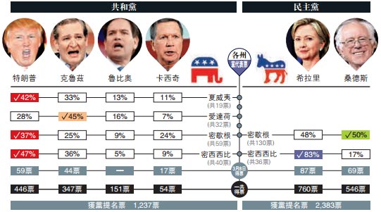 在民主党方面,桑德斯以微弱多数赢得了密歇根州,得票率是49.8%,希拉里的得票率是48.2%。在密西西比,希拉里则凭藉非裔选民的踊跃投票,以83%的得票率将桑德斯远远抛在后面。截至8日,希拉里拥有选举人票760张,桑德斯拥有546张。