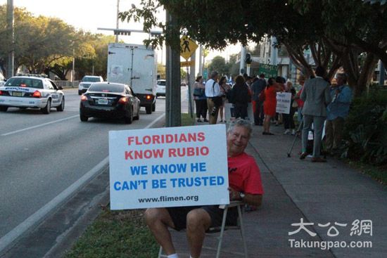 在当晚辩论会场外,一位退休的反卢比奥的老先生下午五点不到就来到路边占位子 大公报摄