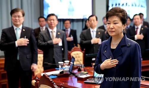 15日,在青瓦台,韩国总统朴槿惠与国务委员向国旗行礼(韩联社)