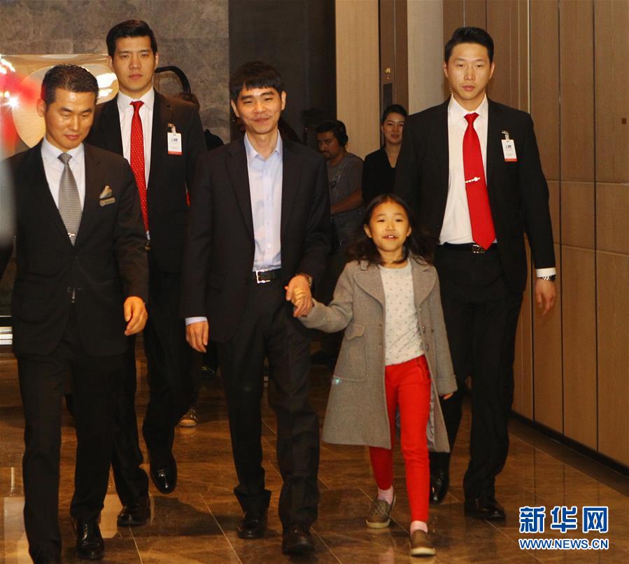 3月15日,李世石(左三)带着女儿(前右二)准备进入赛场。当日,韩国九段棋手李世石与“阿尔法围棋”在韩国首尔进行第五场对弈,但最终失利。新华社记者姚琪琳/摄