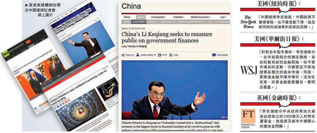 大公网3月17日讯(驻伦敦记者 李威)为期半个月的中国人大、政协两会闭幕,国务院总理李克强在16日举行中外记者会,他的讲话要点在第一时间登上国际媒体的头条。美英等西方主流媒体几乎同时引用他强调的“中国不可能完不成经济目标”为标题,指中国领导人对经济不会硬着陆及长期向好充满信心。此外,他对推动改革、中美关系、香港发展等问题的回应,也得到各国媒体的广泛报道和热议。