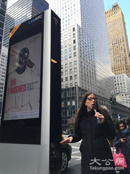 140台“连接纽约LinkNYC”免费WIFI设备日前逐步开始启动服务。公司总经理珍·亨斯利向记者展示设备使用方法 大公摄