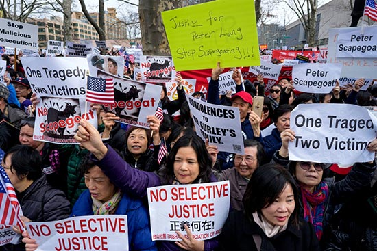 图:2月20日,纽约华人在布鲁克林区示威,声援梁彼得/美联社