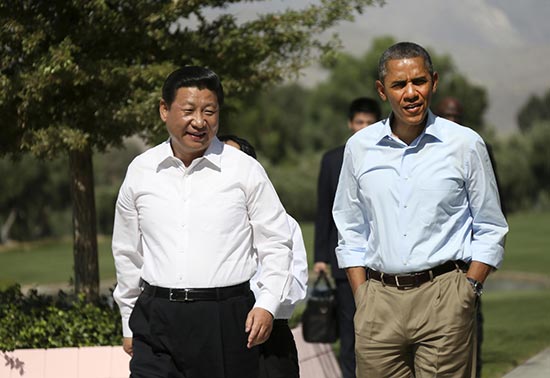 图:2013年6月8日,习近平同奥巴马在加州举行庄园会晤/资料图片
