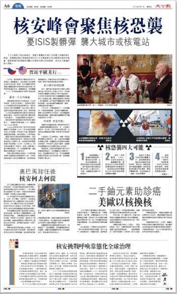 大公网4月1日讯 综合路透社、美国《华尔街日报》及英国《金融时报》报道:美国总统奥巴马当地时间3月31日在华盛顿主持召开第四届核安峰会,极端组织可能发动核恐袭以及朝鲜白热化的核威胁,成为本次峰会的两大焦点。