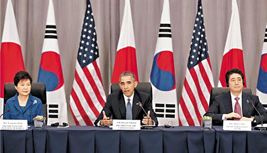 大公网4月1日讯(驻纽约记者黄晓敏)在第四届核安全峰会开幕前,奥巴马总统与日本首相安倍晋三、韩国总统朴槿惠举行了三边会晤。三国领导人在会后举行的记者会表示,将进一步合作,共同应对朝鲜核挑衅。