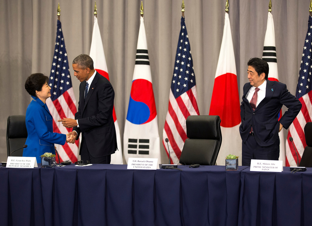 大公网4月2日纽约讯(记者黄晓敏)在第四届核安全峰会开幕前,美国总统奥巴马与日本首相安倍晋三、韩国总统朴槿惠周四举行了三边会晤。三国领导人在会后举行的记者会表示,将进一步合作,共同应对朝鲜核挑衅。周五,朝鲜再向东海方向发射一枚地对空短程导弹,警告意味十足。
