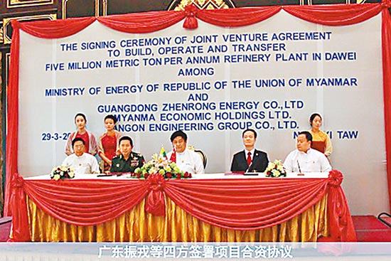 上月29日在缅甸首都内比都,缅甸投资委员会主席正式签发了由广东振戎主导规划在缅甸德林达依省土瓦市建设年加工原油500万吨炼油厂项目的投资许可证。当日,广东振戎能源有限公司、缅甸经济控股有限公司(缅甸国防军总司令部所属企业)、缅甸石化公司(缅甸国家能源部企业)、仰光工程集团有限公司举行了合资协议签字仪式,在缅甸有关部委及各有关方代表的见证下,四方签署了协议。据路透社透露,广东振戎获得项目70%的股份。