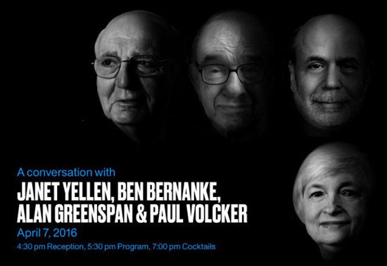 大公网4月8日讯 (驻纽约记者 黄晓敏)沃克尔、格林斯潘、伯南克、耶伦,从1979年到今天的四任美联储主席,7日齐聚位于纽约曼哈顿的国际交流会馆(International House),畅谈联储主席的理念与个人信仰对其做出具有国际影响力的决策的影响(现年90岁的格林斯潘在华盛顿以视频互动方式参与了讨论)。