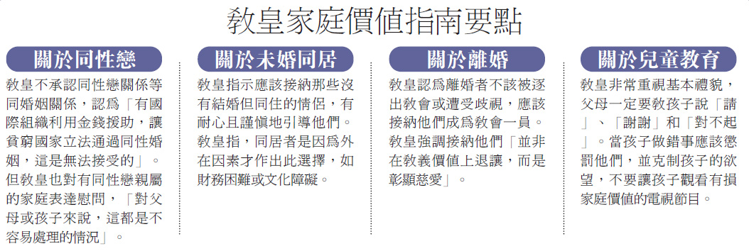 大公网4月9日讯 综合美联社、英国《卫报》报道:教皇方济各8日发表有关家庭价值的宗座劝喻(Apostolic Exhortation),呼吁全球12亿信徒,需了解现代家庭生活的复杂,并尊重不同性取向人士。不过,劝喻仍指同性伴侣不能跟异性婚姻相提并论,被视为教廷仍保守应对同志婚姻议题。